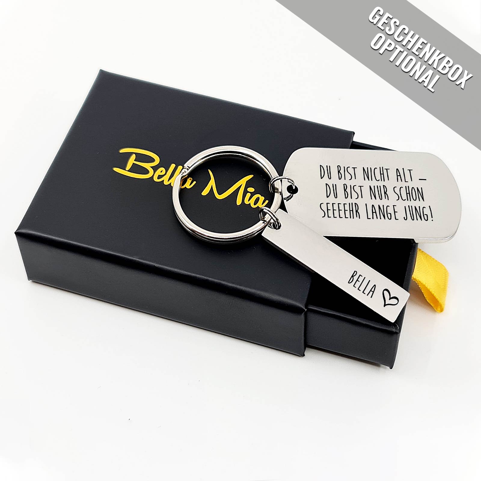 Ein weiteres Jahr älter – aber von alt kann keine Rede sein! Unser hochwertiger Edelstahl-Schlüsselanhänger mit der Gravur „Du bist nicht alt – du bist nur schon seeeehr lange jung!“ ist das perfekte Geburtstagsgeschenk. Jeder Anhänger wird mit Liebe handgefertigt und kann auf Wunsch mit Namen personalisiert werden – ein charmantes, persönliches Geschenk mit Augenzwinkern.