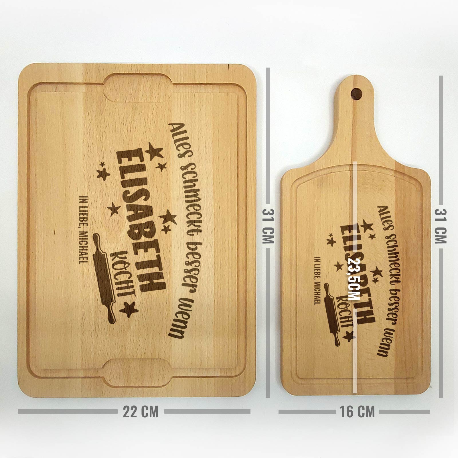 Holz ist ein Naturprodukt, daher kann die Gravur leicht von den gezeigten Fotos abweichen. Die Maserung des Holzes beeinflusst die Farbintensität der Gravur, wodurch jedes Brett ein echtes Unikat wird!